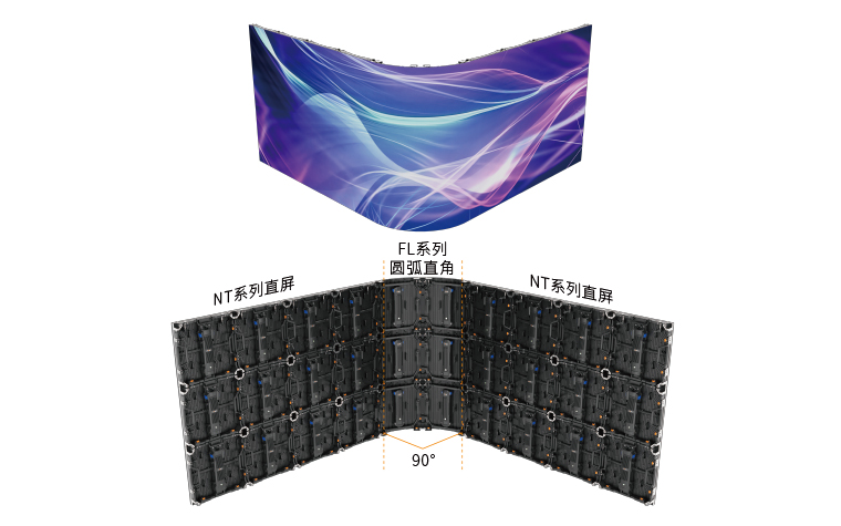 ⑤ 完美圓弧直角,轉(zhuǎn)角半徑更?。簩L系列2列箱體的角度調(diào)整成-45°后連接在一起,即可打造出90°圓弧直角,兩側(cè)建議拼接NT系列直屏,以節(jié)約購屏成本。當(dāng)與NT系列互拼時,只需向互拼屏發(fā)送一個配置文件即可,互拼屏顯示一致性效果更佳。